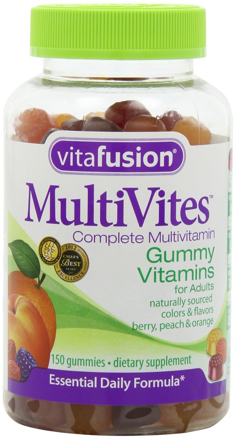 Vitafusion multi vites chewable gummy vitamins for adults, 150 ct, Natural colors and flavors: berry, peach and orange, 2 gummies have as much Vitamin A as a cup of broccoli, 2 gummies have as much Vitamin C as one tangerine, 2 Gummies have as much Vitamin D as 3 oz of salmon, Contains 200% Vitamin D